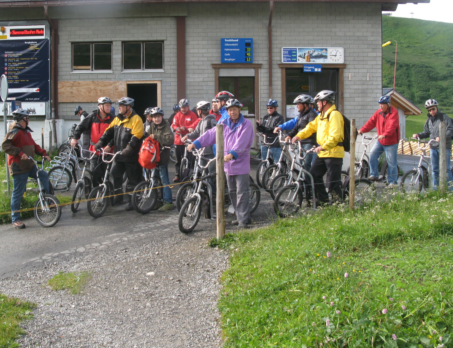| Mercredi : jour de mauvais temps. Qu’importe, sur l’invitation de la famille Spoeri, que nous remercions vivement, les Fribourgeois ainsi qu’une équipe de Langenthal sautent sur l’occasion et font une journée de trottinette pour partir à la découverte de la région, en dévalant les chemins et le routes, puis en rejoignant les sommets en télécabine. Le matin se passe très bien, par un temps couvert. Après une pause pour le dîner, la pluie fait son apparition, progressivement. La dernière descente a lieu sous une pluie battante. De retour à l’hôtel, il faut mettre sécher pantalons et chaussures dans le local de chauffage. Hugo de son côté a profité de la journée pour reprogrammer sa télécommande de A à Z. |