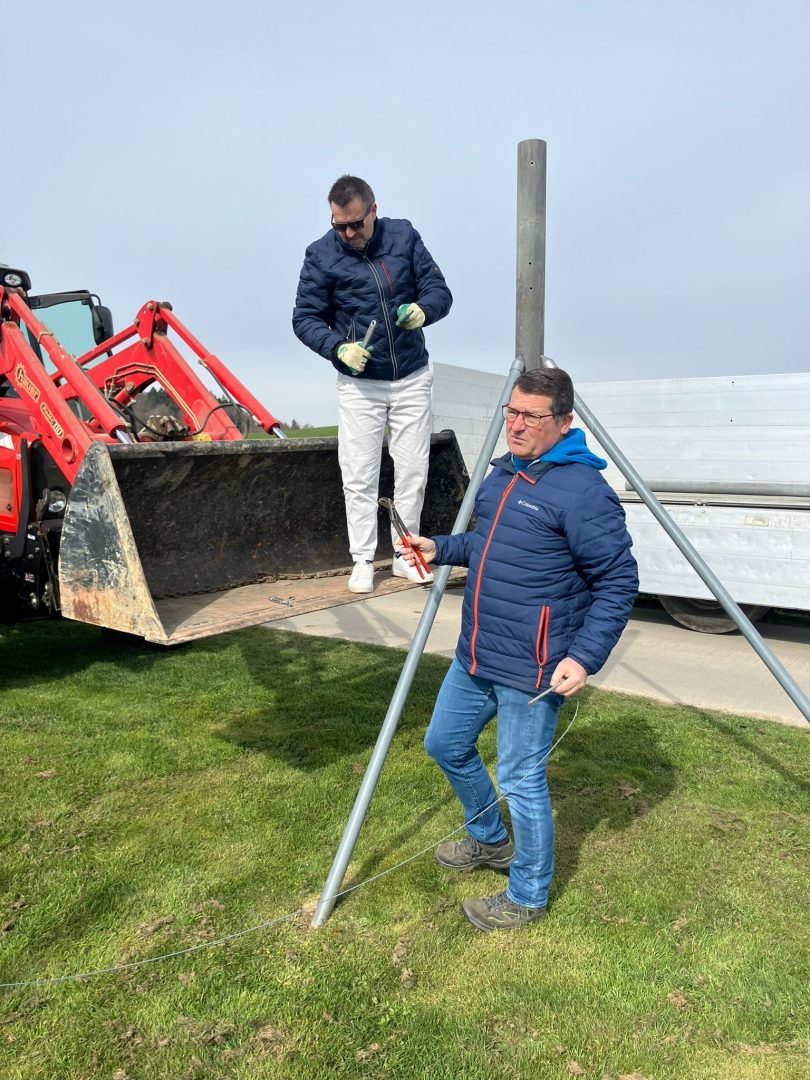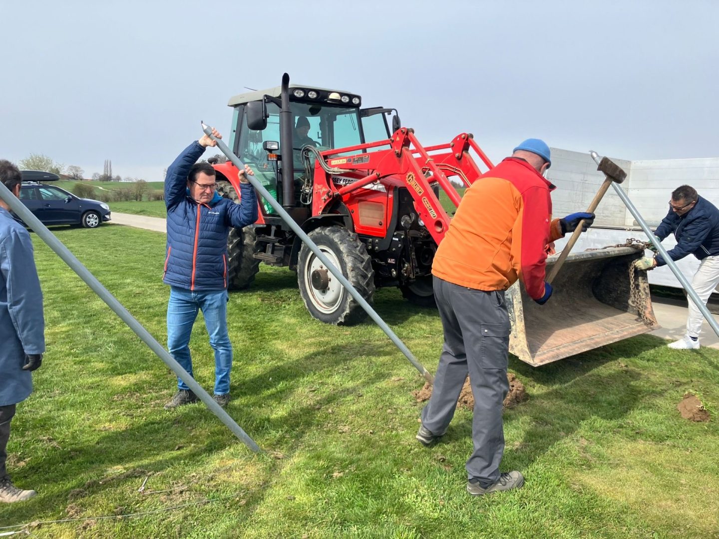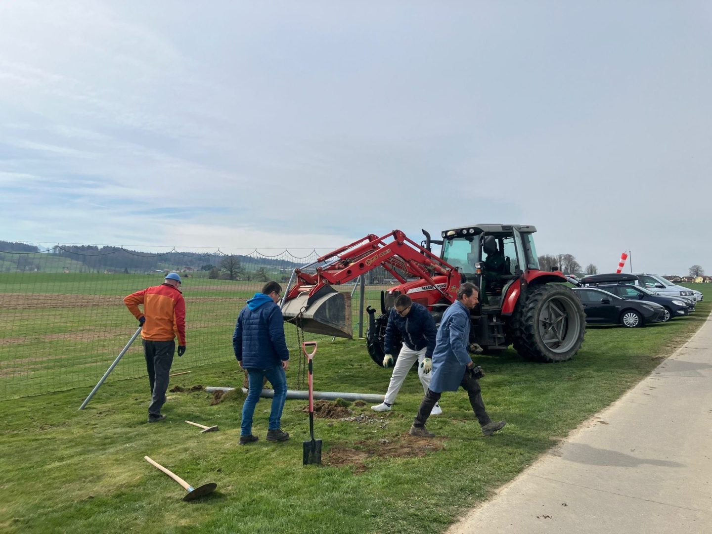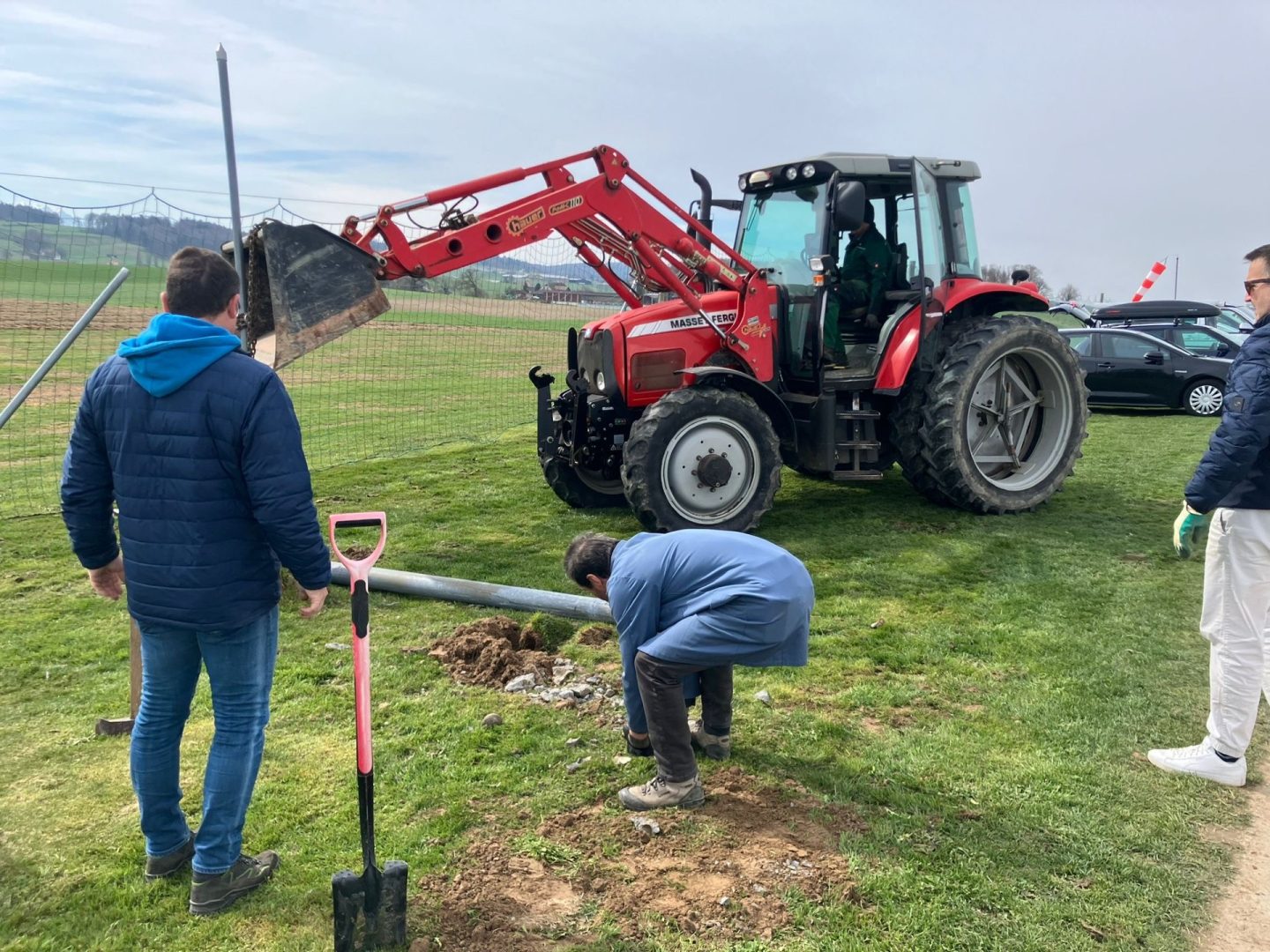 Präsident Thomas Werren bat bei der Begrüssung die Anwesenden, sich in zwei Gruppen zu bilden. Ein Team erhielt den Auftrag, die Baracke aufzuräumen, nicht mehr benötigtes Material zu entsorgen, Tische, Bänke und Grill zu reinigen etc. Das zweite Team formierte sich um Ernst Berger, der mit dem Traktor die Stahlposten samt Betonverankerung nahe der Baracke, die seinerzeit für die Befestigung eines Sonnenschutzes installiert worden waren, aus der Erde riss. Der Sonnenschutz wurde in der Vergangenheit nur sehr selten benutzt und da wir seit Kurzem über zwei, schnell aufgebaute Zelte verfügen, entschied der Vorstand, die Pfosten zu entfernen. Die durch die Entfernung der Pfosten entstandenen Löcher füllten wir wieder mit Erde auf – Ernst kümmerte sich um die Entsorgung des Materials.