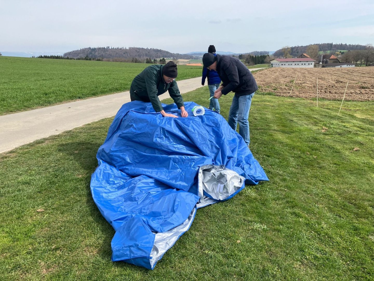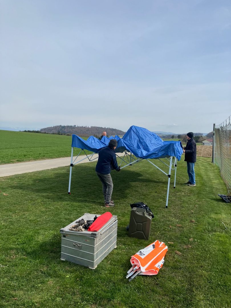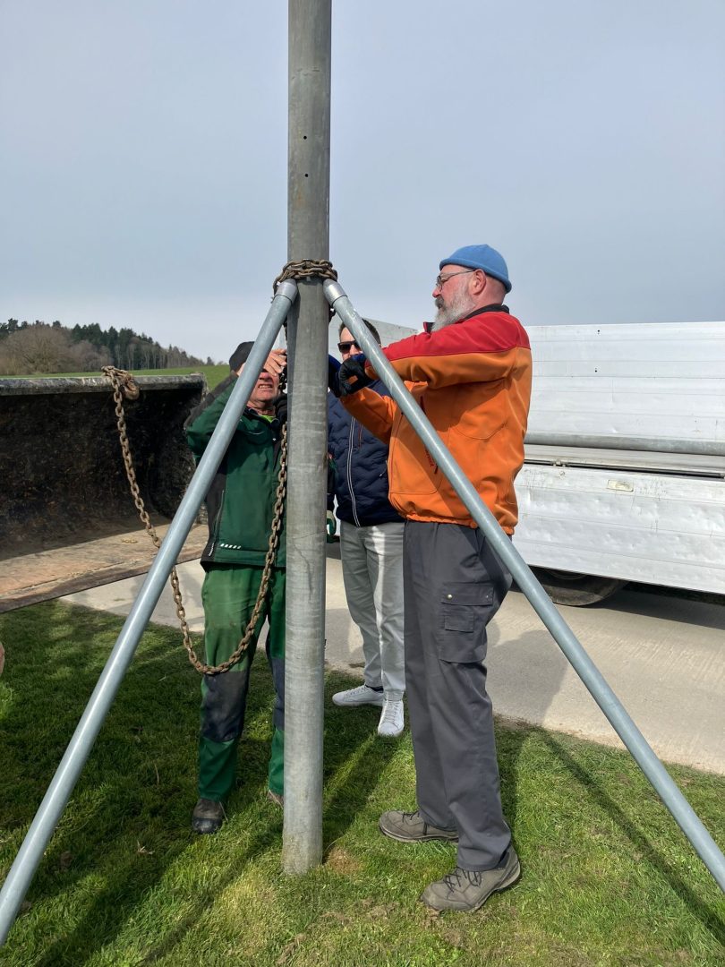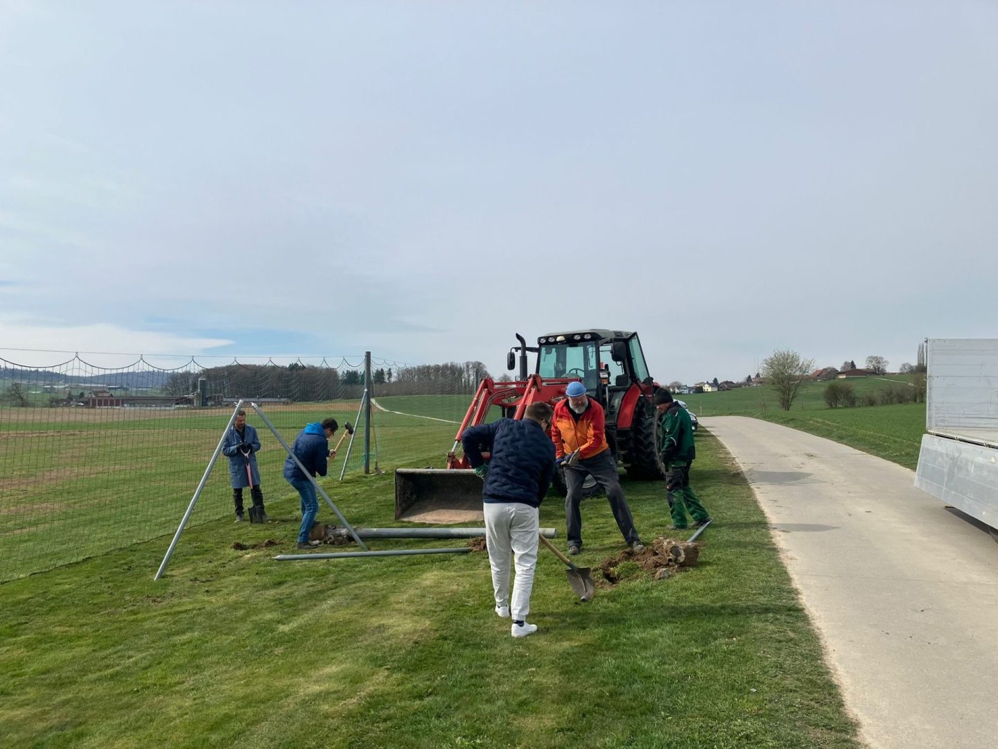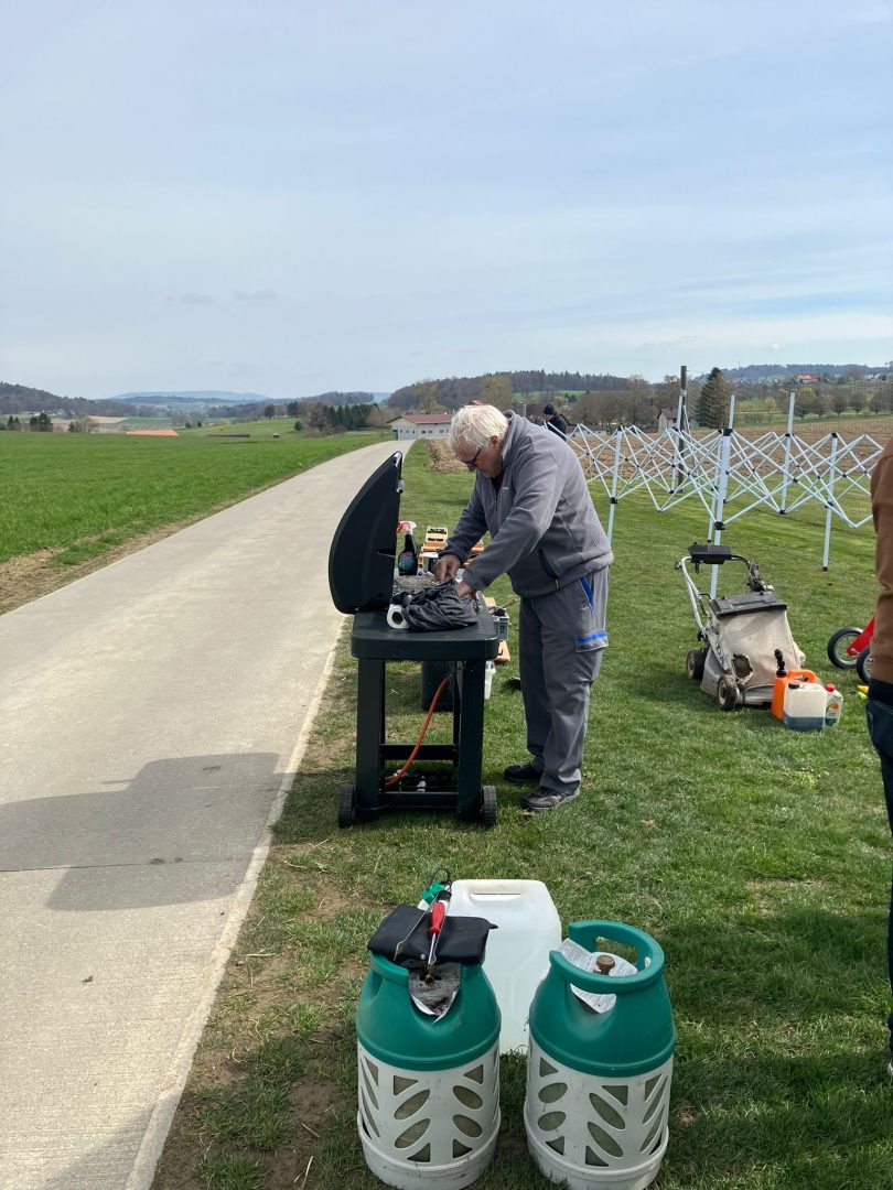 Präsident Thomas Werren bat bei der Begrüssung die Anwesenden, sich in zwei Gruppen zu bilden. Ein Team erhielt den Auftrag, die Baracke aufzuräumen, nicht mehr benötigtes Material zu entsorgen, Tische, Bänke und Grill zu reinigen etc. Das zweite Team formierte sich um Ernst Berger, der mit dem Traktor die Stahlposten samt Betonverankerung nahe der Baracke, die seinerzeit für die Befestigung eines Sonnenschutzes installiert worden waren, aus der Erde riss. Der Sonnenschutz wurde in der Vergangenheit nur sehr selten benutzt und da wir seit Kurzem über zwei, schnell aufgebaute Zelte verfügen, entschied der Vorstand, die Pfosten zu entfernen. Die durch die Entfernung der Pfosten entstandenen Löcher füllten wir wieder mit Erde auf – Ernst kümmerte sich um die Entsorgung des Materials.